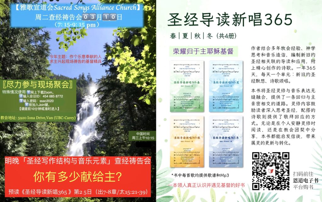 主日崇拜 Sunday Worship 时间:周日Sunday 10:00-12:00 am地址:5920 Iona Drive, Vancouver〖若有变动请联系Heman牧师〗 音乐团契 Music Fellowship 时间:周日Sunday 1:00-3:00 pm地址:5920 Iona Drive, Vancouver〖若有变动请联系Heman牧师〗 查经祷告会Prayer Meeting & Bible Study 时间:周二Tuesday 7:15-9:15 pm地址:5920 Iona Drive, Vancouver〖若有变动请联系Heman牧师〗 青年团契 Youth Fellowship 时间:周四Thursday 6:00-9:00 pm地址:请联系Rev. Heman